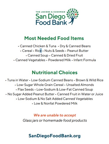 Our annual Holiday Giving initiative is a way for students to spread cheer this holiday season while developing an appreciation for what they have, showing gratitude towards others, and seeing the positive impact of their actions. This year, we are collecting non-perishable food donations for families in need. We are proud to partner with the San Diego Food Bank this season. Collection bins will be available in the lobby to gather non-perishable food donations. Thank you for helping us support families in need and teach our students the importance of giving back!